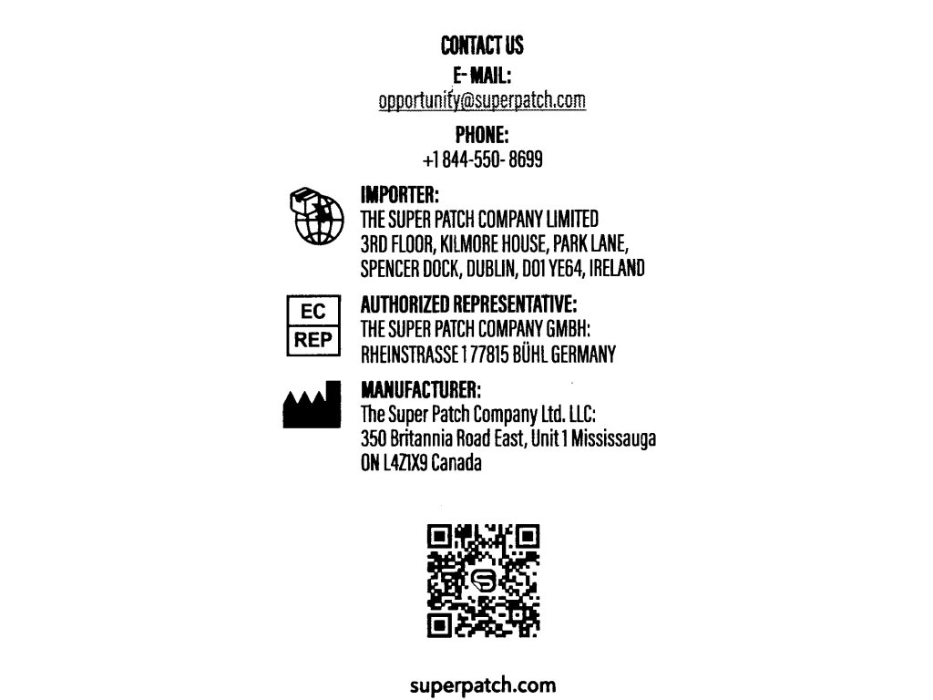 | Výrobce: | The Super Patch Company Ltd. LLC: 350 Britannia Road East, Unit 1, Mississauga, ON L4Z1X9 Canada |